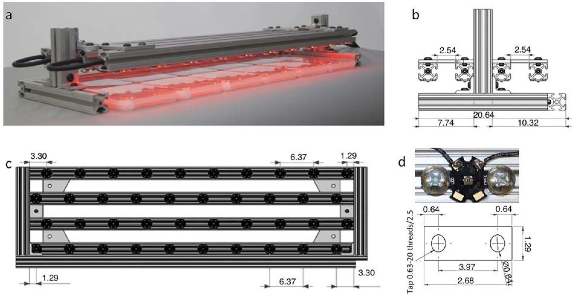For irradiation, Petri dishes sit beneath an array of 40 far-red LEDs delivering 18 μmol/m2/s at the Petri dish surface. The design consists of four light rails of 25.4×25.4 mm 80/20 (four open T-slots profile; 80/20 Inc., Columbia City, IN), each with 10 far-red LEDs mounted evenly spaced and staggered with respect to the neighboring light rail to improve light coverage as shown in Figures 3a–c. The LEDs are wired as two independent circuits of 20, run in series at 44 VDC and 700 mA from a constant current driver (LPC-35-700, RapidLED, Burlingame, CA). Each LED has a custom steel nut as shown in Figure 3d, built to fit the exact size of the LED. The nut mounts the LED to the 80/20 rail and thermal grease is used to facilitate a higher rate of heat transfer from the LED to rail.