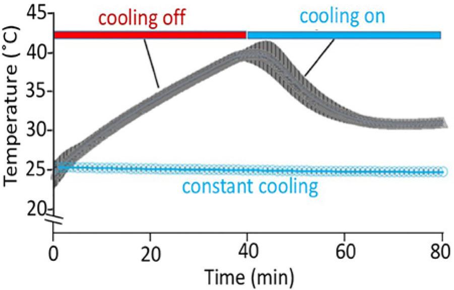 Temperature profiles recorded below the far-red light treatment device. Data represent mean ± SEM, n=3. Upper trace, stress test for local heat buildup, with the liquid cooling system being activated at 40 min. Lower trace, temperature below the light rail with the liquid cooling system running continuously.
