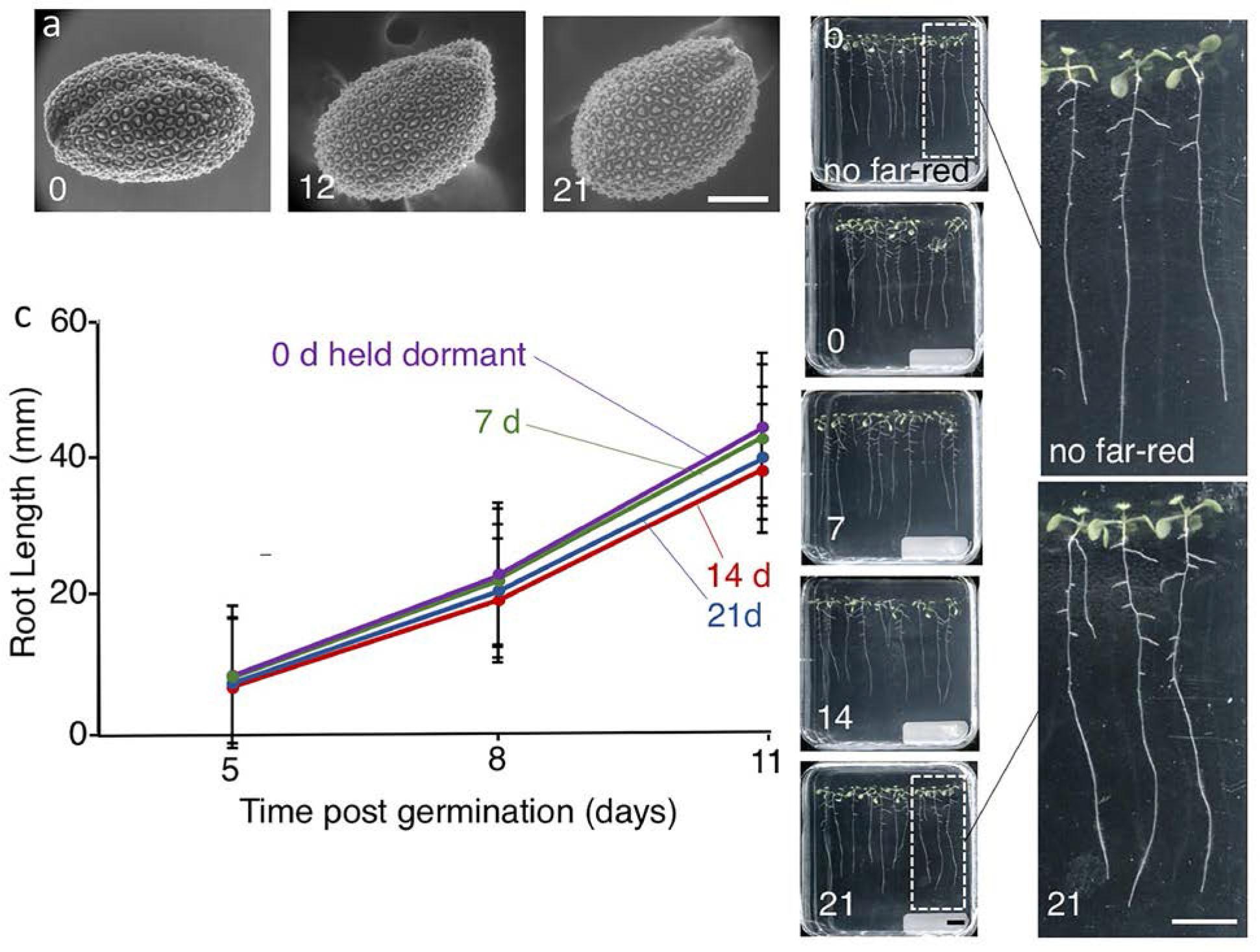 To ensure that such far-red irradiation imposed dormancy did not alter subsequent growth and development of seedlings once the seeds were triggered to germinate, we next imposed dormancy with far-red light. Seeds were kept dormant in the dark for various periods and then seed morphology and subsequent seedling growth were assessed. Figure 5a shows that at the resolution of the scanning electron microscope, there was no obvious change in seed morphology or evidence of germination over the period of far-red-induced dormancy and storage in the dark. Similarly, when growth was followed after induction of germination, seedling morphology (Figure 5b) and growth rates (Figure 5c) were similar between samples irrespective of the time they were held dormant before induction of germination. These results indicate that far-red irradiation with subsequent storage at room temperature in the dark (foil wrapped plates) is an effective way to delay germination compatible with flight timelines and potential flight-related delays.
