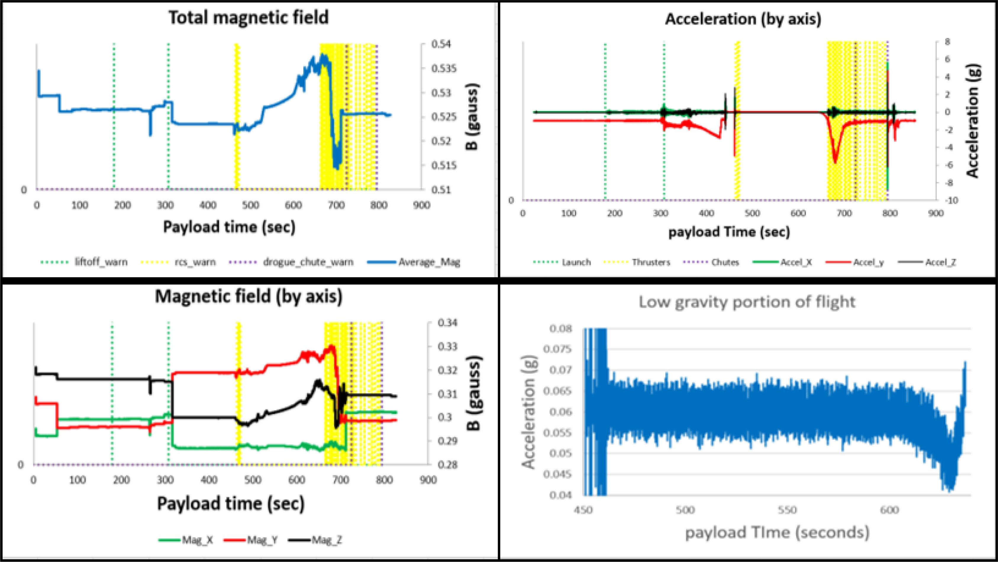 4th mission on the Blue Origin New Shepard sRLV. Left middle: Magnetic field observations by axis. y-axis vertical in CC, x and z axes orthogonal to y-axis. Bottom middle: Rotation (deg/s) observations. Top right: Micro-gravity period analysis (g). Right middle: Total magnetic field observations (gauss). Bottom right: Acceleration (g) observations by axis.