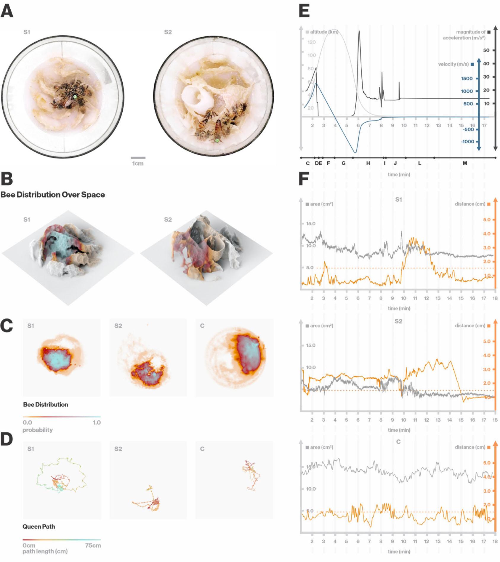 Analysis of video data for queen and retinue bee regulatory mechanics during suborbital flight. (A) A video frame from each space-bound module at a sample timepoint during flight; queens S1 and S2 each bear a green dot on their thorax, while ~10 worker bees per module form a retinue (for full video, see SI Video 1). (B–F) Quantification of queen and retinue behavior was derived through several computational video analysis techniques: (B) Bee Spatial Distribution within the compartment was calculated from video data by assigning a value of 1.0 to pixels containing bees per each frame and 0.0 elsewhere, and summing values over all frames (L+0 m to L+18.75 m). Values were normalized to a range from 0.0 to 1.0 and assigned a heatmap color; subsequently, this was mapped to the 3D topology of the beeswax-furnished compartment for S1 and S2, and (C) also displayed in a 2D format for comparison of S1, S2, and control C1. (D) Queen Tracking, obtained by isolating the G channel of the RGB image sequence and mapping the trajectory of the green marker sequentially across all frames, visualized the 2D path of queens during the flight; this was assigned a color gradient according to arc length for comparison of S1, S2, and C1 queen paths. (E) Data-logged IMU and flight phase data are translated to altitude (m, gray line), velocity (m/s, blue line), and acceleration force (m/s2, black line) per 1 s time increments and graphed over time. Letter Codes correspond to flight phases in Table S2. (F) Cluster Area Measurement (“retinue area,” gray line) and Queen Distance-From-Cluster-Centroid Measurement (“queen distance,” orange line) are respectively calculated by determining total area of bee-occupied pixels per frame and measuring distance from the centroid of the total bee area to the centroid of the queen dot per frame. Each is plotted over time for S1, S2, and C1 queens as a proxy for maintenance of nominal retinue formation around the queen. As a benchmark for Queen Distance-From-Cluster-Centroid values, a common definition for retinue ellipse establishes ≤1.5 cm (orange dashed line) as the nominal distance from a queen to an attending retinue.