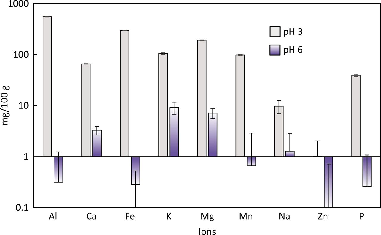 ICP-OES measurements of raw arcillite (no added fertilizer) after extraction with HCL (pH 3) and with 10 mM Tris/HCL buffer (pH 6). Large quantities are released under acid conditions but absent in at pH 6. Soluble ions were less than 1/10 of the acid extract.