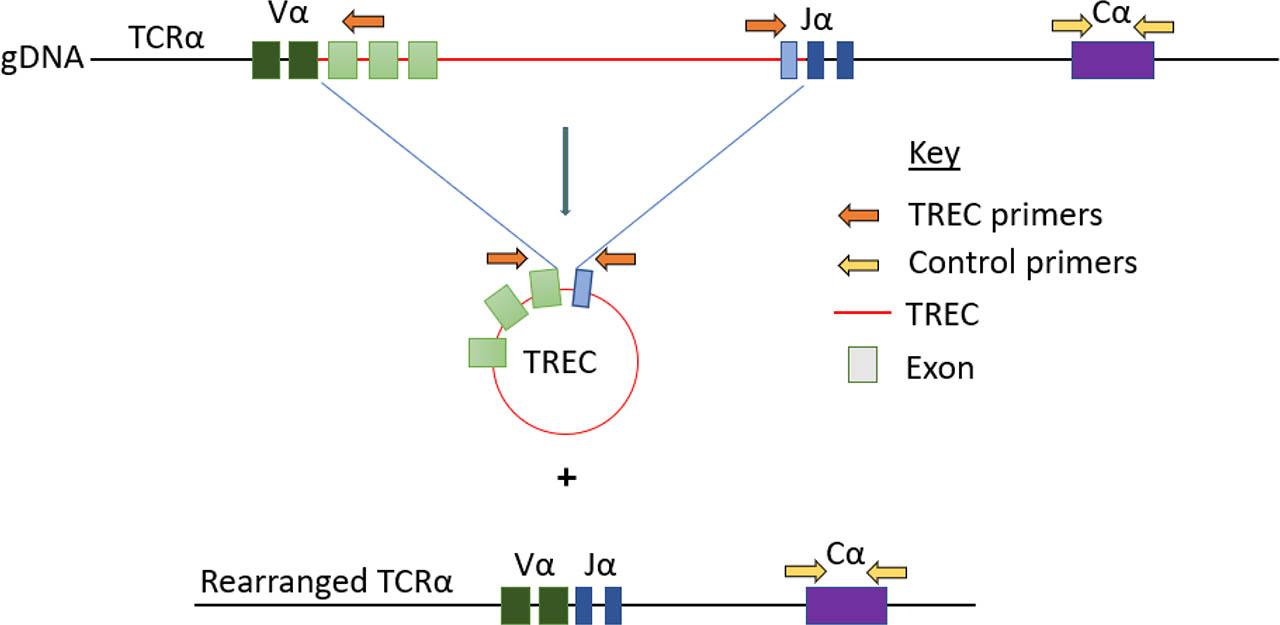 TREC formation and primer design. Schematic of TREC formation following VJ recombination at the Tcra locus. Primers are depicted by arrows and are designed to face toward each other following formation of the TRECs (Hazenberg et al., 2001). PCR amplification is expected when primers face each other.