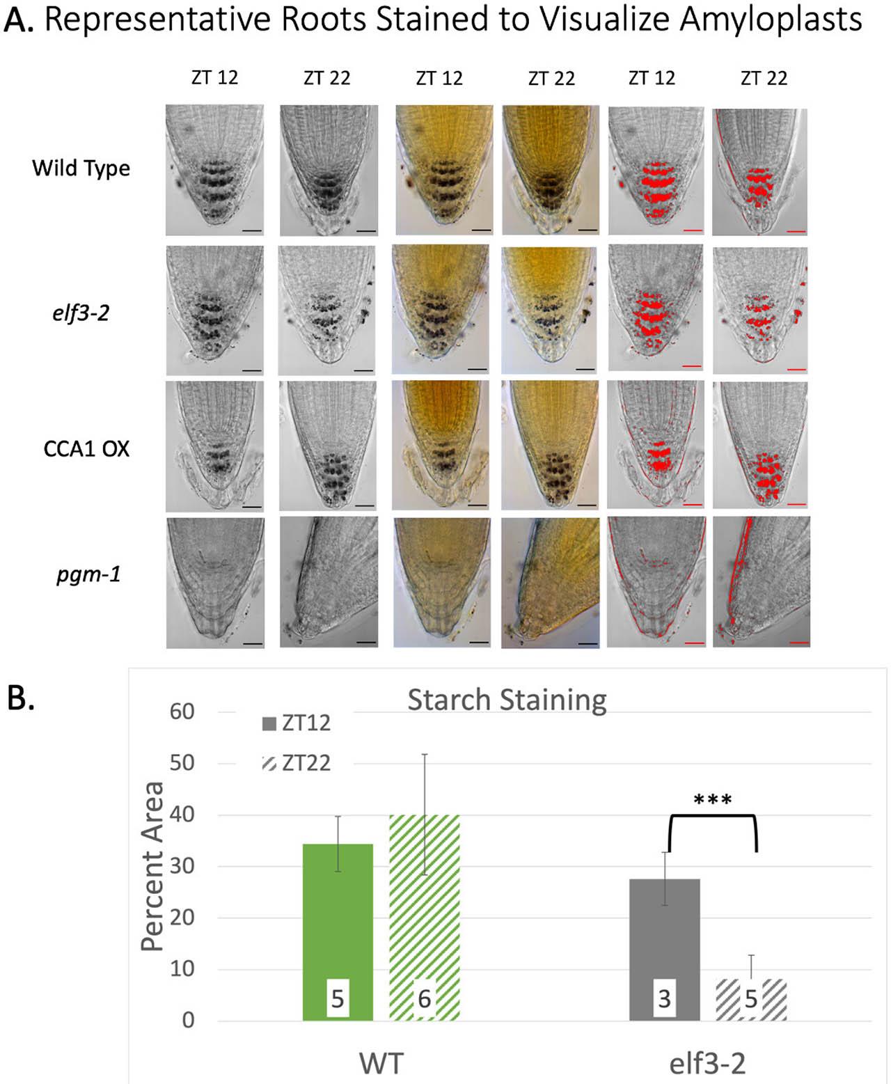 Starch staining of amyloplasts at ZT12 and ZT22. (A) Representative images of root tips from WT, elf3-2, CCA1 OX, and pgm plants stained for starch. We stained roots that were harvested and fixed at ZT12 or ZT22. The starchless pgm-1 genotype was used as a control for background staining levels. Scale bar represents 25 μm. (B) The average percent area was calculated for WT and elf3-2 plants at both time points, ZT12 (solid), ZT22 (striped). Error bars indicate standard deviation. *** indicates p-value < 0.001, two-sided t-test comparing ZT22 to ZT12. n for each genotype and time point is shown at the bottom of the bar. ZT, Zeitgeber time.