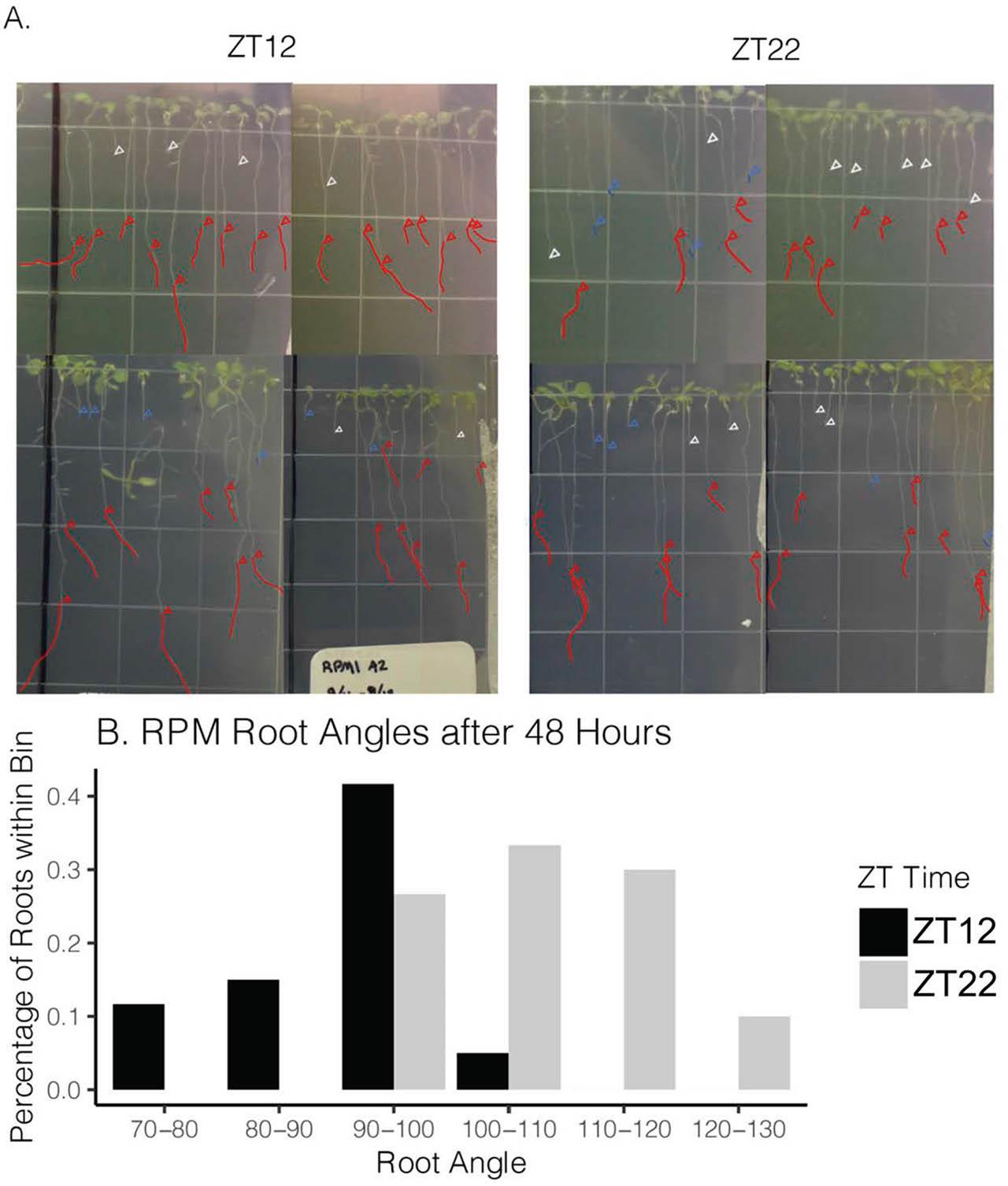 Growth on a RPM indicated that the time of day the plants first perceive a loss of 1 g gravity vector affects their response even 48 h later (Figure 8). While a full, detailed quantification of the changes on the RPM will require monitoring the root growth in three dimensions, in this first evaluation, we observe differences in the root orientation after 48 h depending on what time of day the plants were transferred to the RPM. The plants that first sensed simulated microgravity at ZT12 bent more than those that first perceived it at ZT22.
