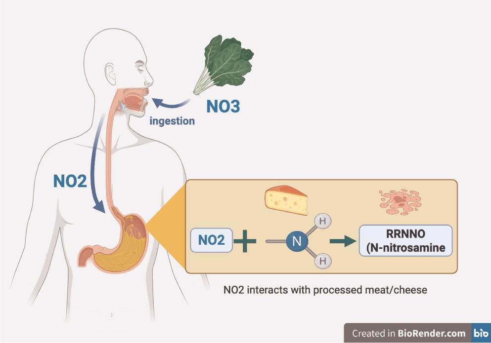 Schematic representation of the metabolic conversion of dietary NO3− into NO2− and the potential formation of carcinogenic nitrosamines under acidic gastric conditions when nitrate-rich vegetables are consumed alongside NO2−-containing preserved foods.