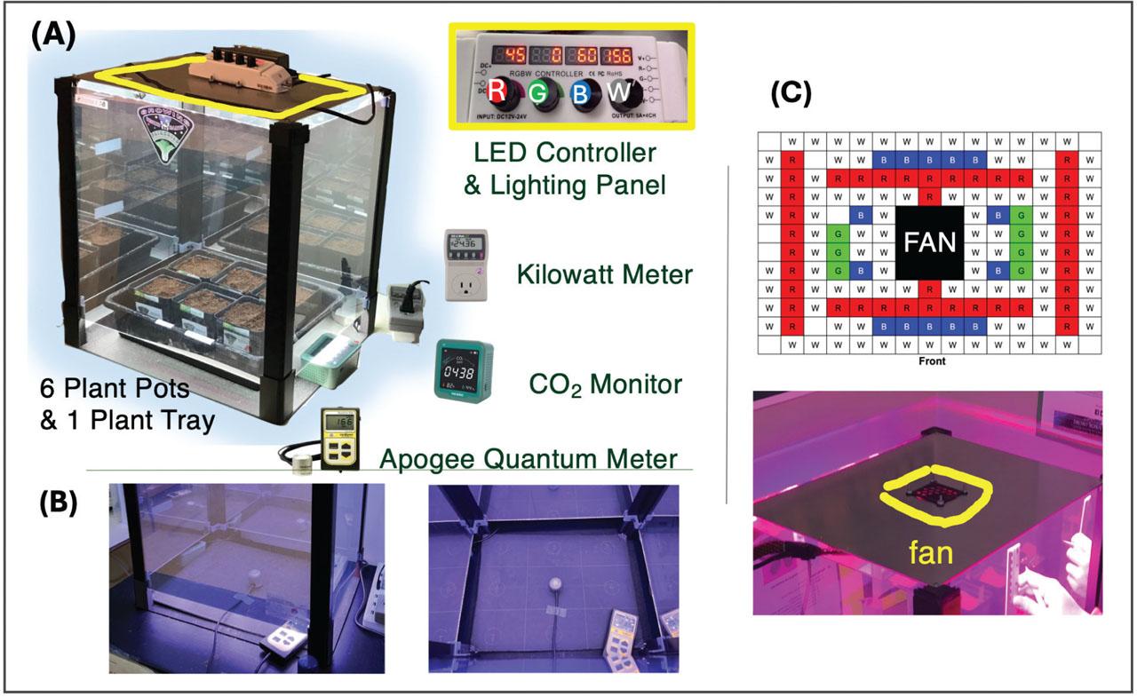 GBE Growth Chamber Setup. (A) The chamber included an LED lighting panel (equipped with red, green, blue, and white LEDs), an LED controller, four reflective side panels, a circulation fan, and environmental sensors (CO2 monitor, kilowatt meter, and quantum meter) to mirror key functions of Veggie and APH operated on the ISS. (B) The quantum meter was placed at the bottom center of the chamber to measure the chamber light intensity in μmol·m−2·s−1 PPFD. (C) LED distribution pattern drawing (top) and a real-world view of the chamber fan (bottom).