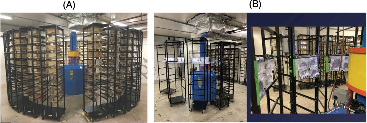 Neutron Radiation Facility at Colorado State University. (A) Rodent radiation experiment setup, showing neutron radiation source in the center. (B) Plant seed radiation setup, illustrating the positioning of seed packets for uniform neutron exposure. Both images are from Dr. Alexander Meyers' 2023 presentation, used with permission.