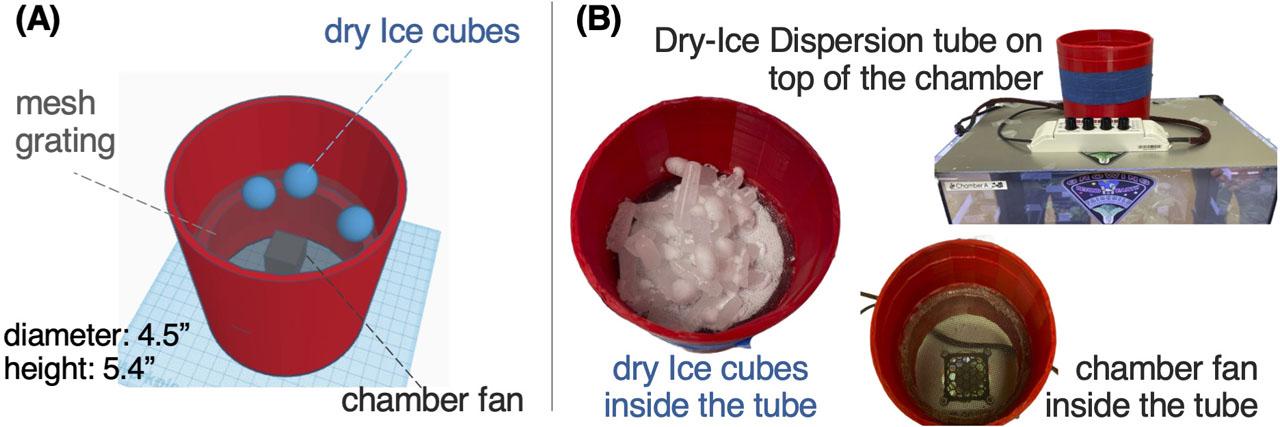Custom-designed 3D-printed dry-ice CO2 dispersion tube setup. (A) A computer-assisted design (CAD) drawing for the system and (B) a real-life image of the system.