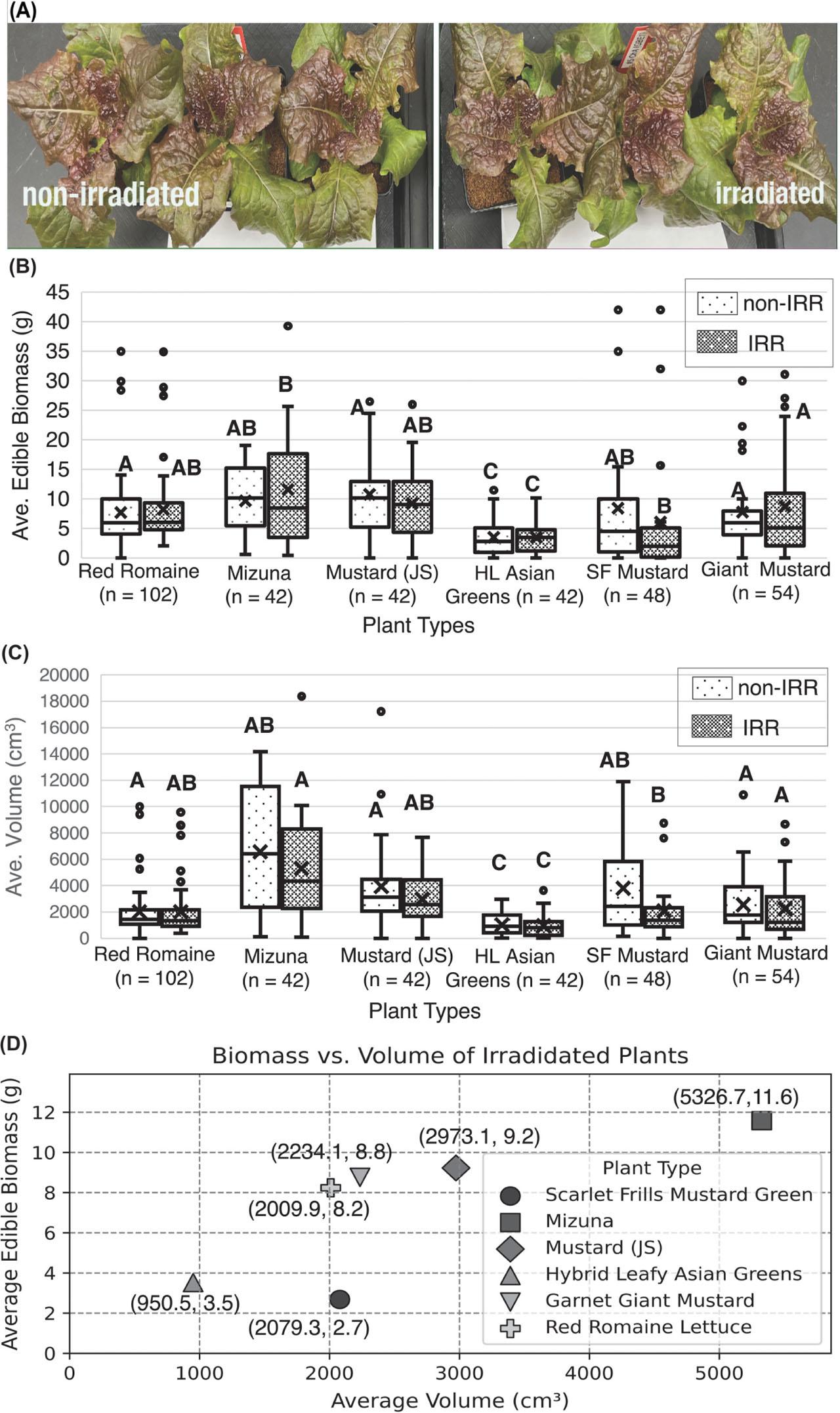 (A) Red romaine lettuce morphology under 230 μmol·m−2·s−1 PPFD treatment. (B) Boxplot analyses of edible biomass across six cultivars. Data are presented as mean ± SEM, with varying sample sizes per cultivar (n = 42–102). Letters indicate statistically significant differences across plant types. (C) Boxplot analyses of plant volume across six cultivars. Data are presented as mean ± SEM, with varying sample sizes per cultivar (n = 42–102). Letters indicate statistically significant differences across plant types. (D) A scatter plot of average edible biomass versus plant volume for irradiated plants across six testing cultivars.