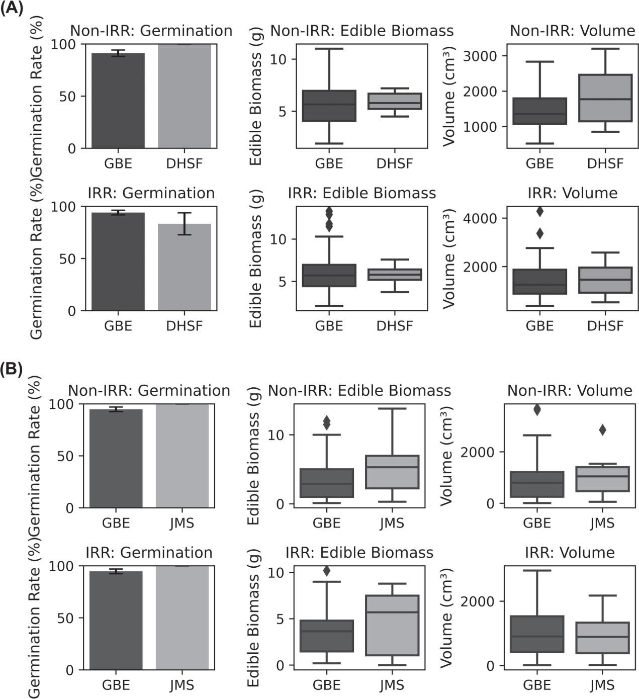 (A) Comparison of germination rates, edible biomass, and plant volume between GBE schools (n = 102) and DHSF (n = 6) for irradiated and nonirradiated red romaine lettuce. Data are presented as mean ± SEM. (B) Comparison of germination rates, edible biomass, and plant volume between GBE schools (n = 42) and JMS (n = 6) for irradiated and nonirradiated hybrid leafy Asian green. Data are presented as mean ± SEM.
