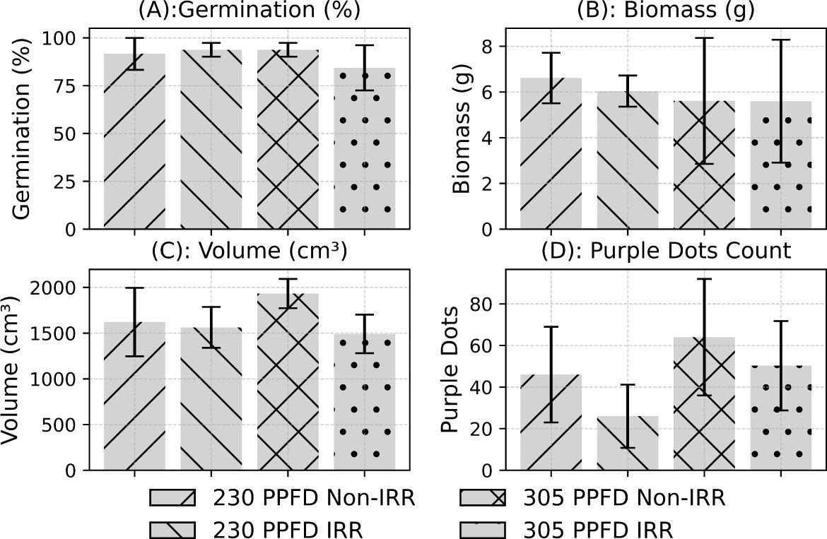 Effects of light intensity (230 vs. 305 μmol m−2 s−1 PPFD) and neutron irradiation on red romaine lettuce's germination (A), biomass (B), volume (C), and purple dot count (D). No significant differences were detected across treatments. Data are mean ± SEM (n = 6 per treatment).