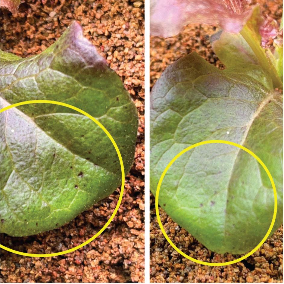 For each trial, one cultivar was grown per chamber for 28 days under a 12-hour photoperiod. Six cultivars were tested: red romaine lettuce (Lactuca sativa cv. Outredgeous), mizuna (Brassica rapa var. nipposinica), mustard (JS) (Brassica carinata cv. Amara), hybrid leafy Asian green (Brassica rapa var. chinensis cv. Rosie F1), Scarlet Frills mustard greens (Brassica juncea), and Garnet Giant mustard greens (Brassica juncea) (Table 1). Two seeds of the same cultivar were planted per pot, and seedlings were thinned to one per pot upon the appearance of the first true leaf. Each chamber contained three pots of irradiated seeds and three pots of nonirradiated seeds of the same cultivar, enabling paired comparisons. Across all trials and schools, this setup yielded sample sizes ranging from 6 to 102 plants per cultivar, depending on the number of replicates and availability of chambers.