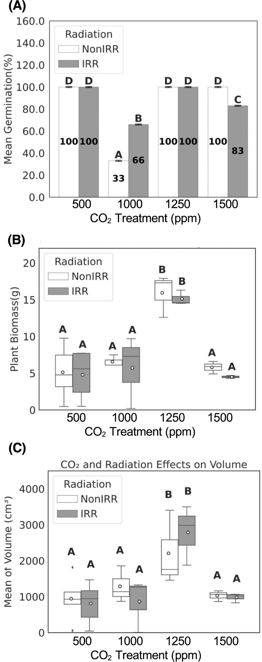 CO2 enrichment significantly influenced the growth of hybrid leafy Asian green, with the most pronounced effects observed at ~1250 ppm. Under ~1000 ppm CO2, nonirradiated seeds exhibited a reduced germination rate (33%) compared to their irradiated counterparts (66%). This trend reversed at ~1500 ppm, where nonirradiated seeds achieved 100% germination [Fig. 9(A)]. For edible biomass, plants grown under ~1250 ppm achieved the highest yields (15.9 g for nonirradiated; 15.1 g for irradiated), significantly outperforming those grown under ~1000 ppm and ~1500 ppm CO2 levels [Fig. 9(B)]. Plant volume followed a similar trend, with the largest mean volumes also observed under ~1250 ppm CO2 [Fig. 9(C)]. Across all treatments, ~1250 ppm CO2 treatment consistently enhanced germination, biomass, and volume compared to ~500 ppm (control) and ~1000 ppm. While seed irradiation improved germination at ~1000 ppm, it slightly reduced biomass production at ~1250 ppm.
