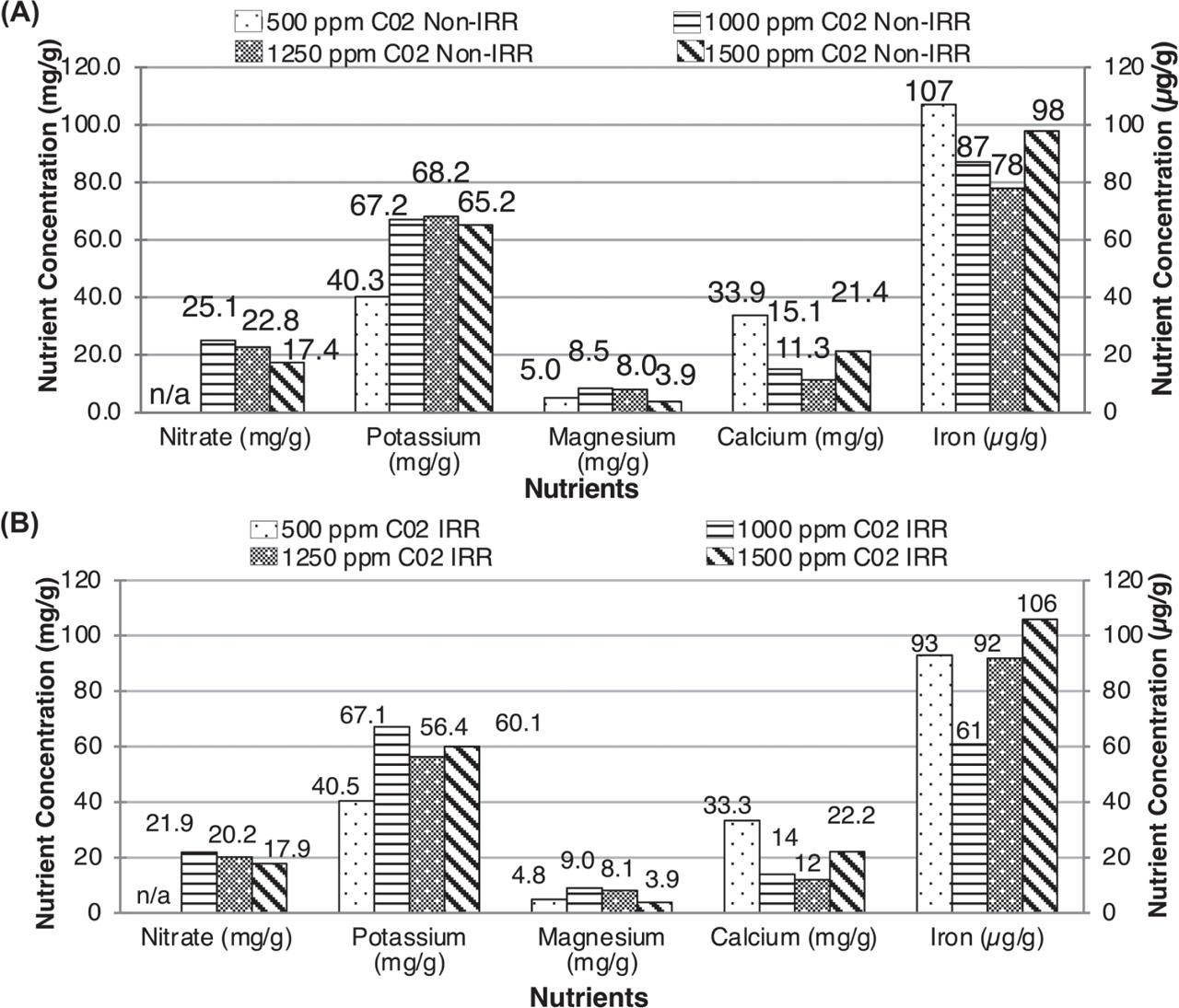 (A) Nutrient composition analysis of harvested nonirradiated (Non-IRR) hybrid leafy Asian green plant leaf tissue under varying CO2 levels. Data are mean ± SEM (n = 3 per treatment). (B) Nutrient composition analysis of harvested irradiated (IRR) hybrid leafy Asian green plant leaf tissue under varying CO2 levels. Data are mean ± SEM (n = 3 per treatment).