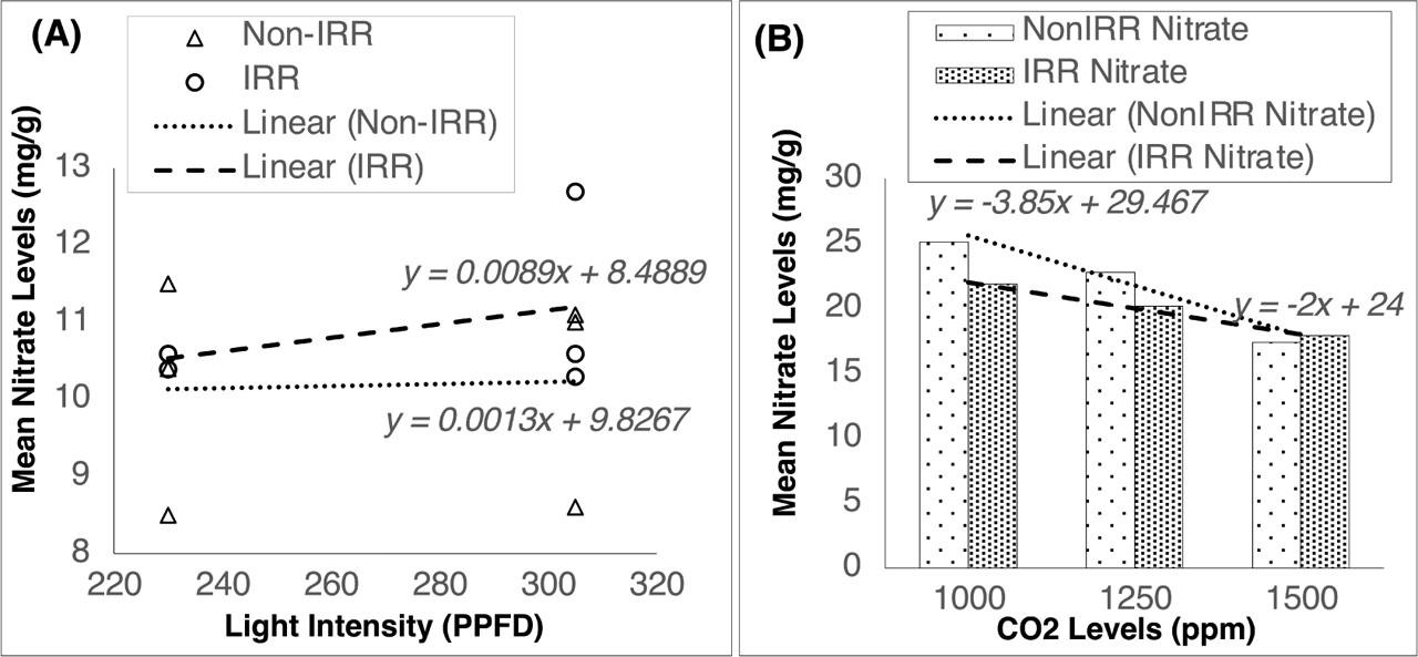 (A) Effects of light intensity on NO3− concentrations of harvest nonirradiated (Non-IRR) and irradiated (IRR) red romaine lettuce plant leaf tissue. Data are mean ± SEM (n = 6 per treatment). (B) Effects of CO2 on NO3− concentrations of harvested (Non-IRR) and irradiated (IRR) hybrid Asian leafy green plant leaf tissue. Data are mean ± SEM (n = 3 per treatment).