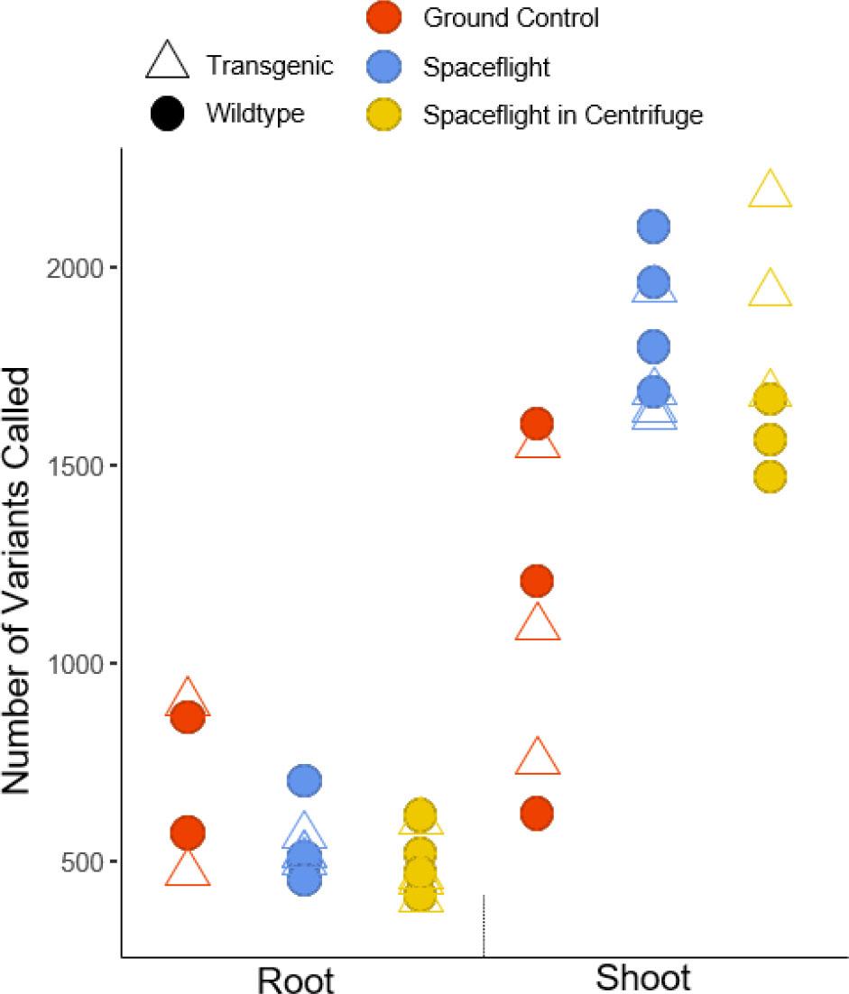 Final variant counts were analyzed in R with a generalized linear model. Spaceflight conditions, tissue type, and Arabidopsis genotype were tested for their contribution to the results. Least square estimates were obtained for all treatment effects, including the main effects of potential interactions. The variant composition was also examined using a generalized linear model with a binomial distribution. Proportions for each type of variant were examined, and treatment effects were tested for their influence on the results.