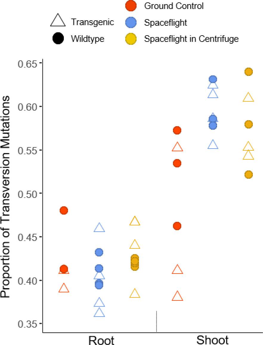 Spaceflight shoot tissue samples had a higher proportion of transversion mutations compared to the ground control shoot tissue samples (estimate: 0.035, p-value = 4.72e-07) (Table 4, Fig. 2). This difference remains significant when samples experiencing simulated gravity in spaceflight are compared to ground control samples, indicating that the effect is not due to microgravity (estimate: 0.031, p-value 7.81e-05) (Table 4, Fig. 2) and that instead, as seen in previous studies (Kunz and Armstrong, 1998; Besaratinia et al., 2004), space radiation is associated with a higher proportion of transversion mutations. Root tissue samples did not show significant differences in the proportion of transversion mutations among either spaceflight condition, consistent with the reduced number of all single nucleotide variants identified in root tissue.
