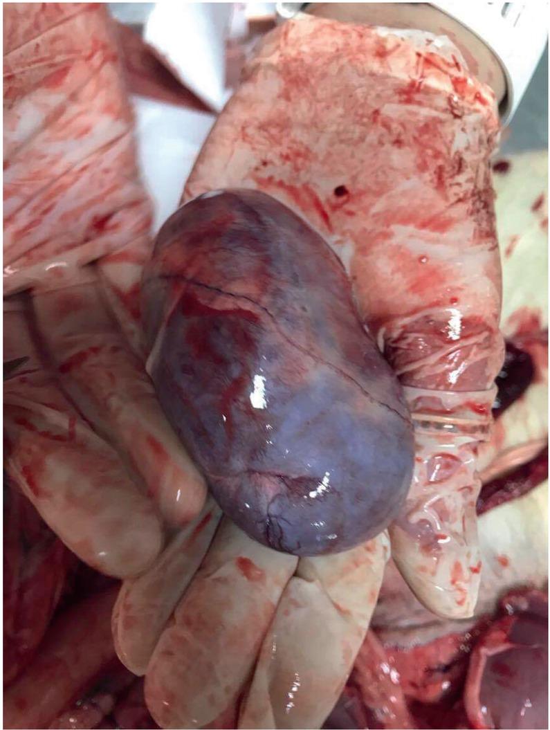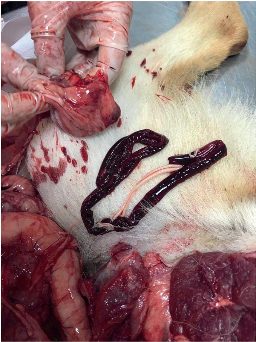 Emergency supportive treatment was initiated with intravenous fluid therapy Lactated Ringer’s solution (Vioser S.A., Greece) at 10 ml/kg/hr however the dog suffered a cardiac arrest and was not resuscitated. The following day, a postmortem examination was performed. The pleural and the abdominal serosal surfaces appeared normal. In the thorax, the lungs appeared normal, however the heart appeared generally enlarged. Internal examination of the heart found about 45 whiteish nematodes later identified as adults of D. immitis, positioned in the right side of the heart from the right atrium, the caval opening and the apex of the right atrial appendage. On inspection of the abdominal cavity, all the visceral organs appeared normal. However, the right kidney was enlarged and soft on palpation, with a cystic appearance. (Fig. 1). The left kidney was normal. During examination and opening of the left kidney, two large nematodes were found (Fig. 2). The entire renal structure was destroyed and there was a thin outer capsule. The two nematodes were collected and placed in saline solution and sent to the Laboratory of Parasitology and Parasitic Diseases of the Aristotle University of Thessaloniki, Greece. At the laboratory, the two specimens were examined under the stereoscope and identified using specific identification keys (Bowman, 2014). The two nematodes were identified as a pair of female and male D. renale measuring 58 cm long and a maximum of 4.2 mm width and 23 cm long and 2.9 mm width maximum respectively.