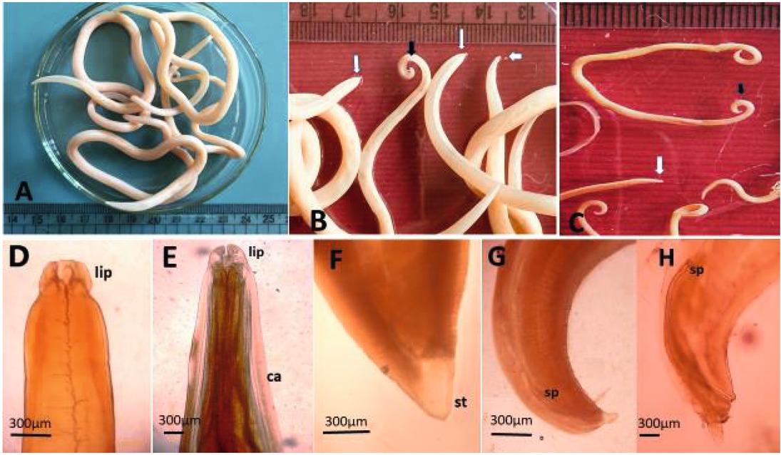 A – B. Toxocara vitulorum collected from calves. B) Anterior end of worm showed lips (short white arrow), posterior end of male showed coiled tail (black arrow), and posterior end of female worm showed a straight tail end (long white arrow). D) Anterior end of T.vitulorum showed three lips (lip), F) posterior end of female showed short tail (st), G) posterior end of male showed two spicules (sp), C) Toxocara canis collected from street dogs; showed the coiled tail-end of male (black arrow), the straight tail-end of female (white arrow), E) Anterior end of T. canis showed the cephalic alae and lips, F) posterior end of male showed spicules.