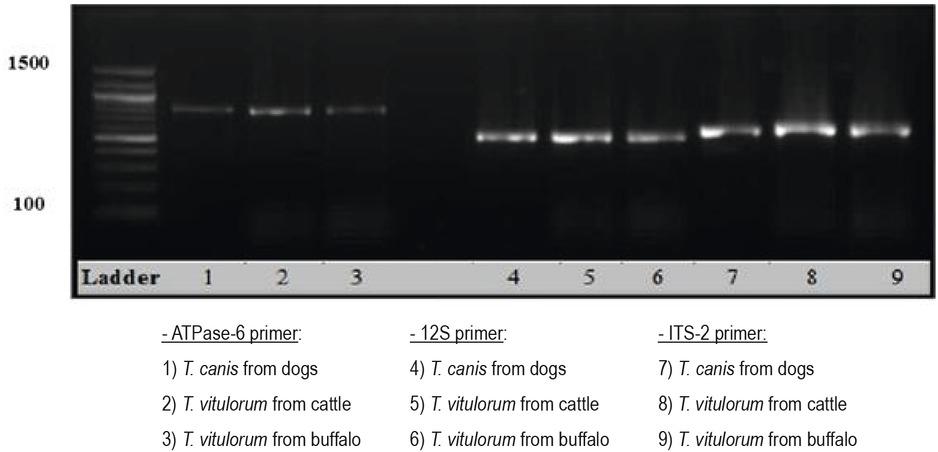 Analysis of the ATPase-6 gene revealed that the sequences of this gene in T. canis of dogs and T. vitulorum from cattle and buffalo-calves were G/T rich. Moreover, the length of the nucleotide sequence in T. canis was 600 bp, while that in T. vitulorum from both cattle and buffalo-calves was 598 bp.