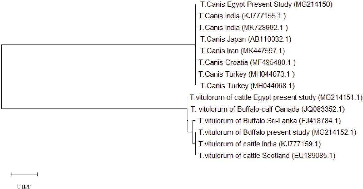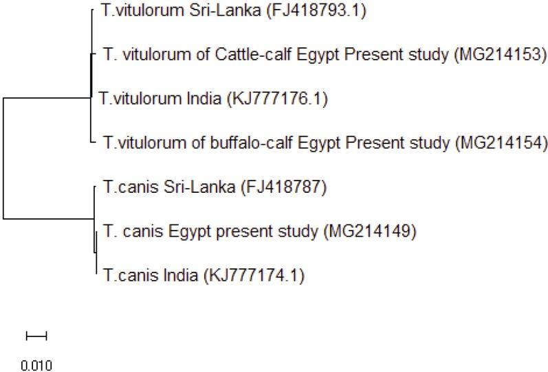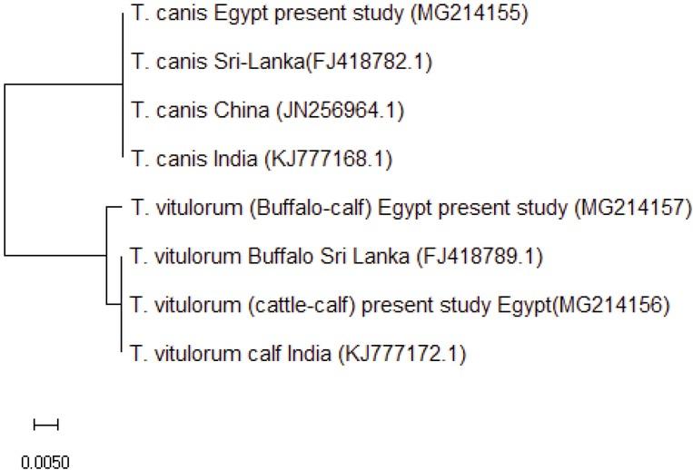 A phylogenetic tree constructed by the neighbor-joining method for the ATPase-6 region. There was 99.16 % identity in this gene between the tested T. vitulorum specimens from cattle and buffalo-calves in the present study, while 87.78 % identity was detected between the tested T. canis and T. vitulorum specimens from Egypt. Additionally, it was revealed that the T. vitulorum from buffalo-cattle calves (MG214154.1) in the current study was closely related to T. vitulorum from in India (KJ777176.1), with 99.50 % identity to that in Sri Lanka (FJ418793.1) with 99.33 % identity. Moreover, the sequence for T. canis in the current study was 100 % identity to that T. canis isolated in India (KJ777174.1) While, with 99.67 % identity to T. canis isolated in Sri Lanka (FJ418787.1), Plate 2.