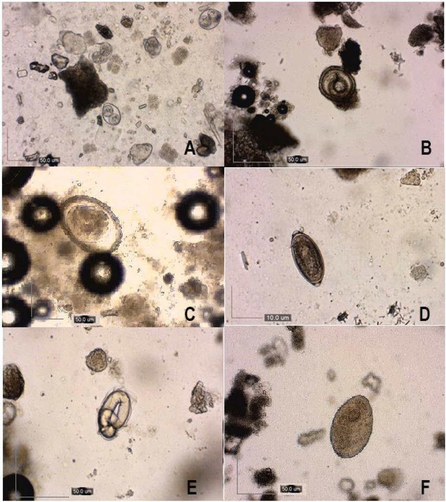 Parasitology diagnosis of soil samples. A) sporulated oocysts of Cystoisospora spp.; B) embryonated egg of T. canis (stage 1 larva); C) egg of T. leonina; D) egg of T. vulpis; E) embryonated egg of ancylostomatidae (stage 1 larva) (gravitation flotation method, ZnSO4); F) egg of A. alata, sedimentation method), 100x