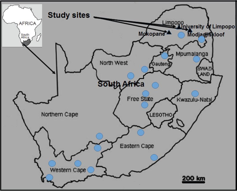 It was, therefore, decided in this study to investigate the diversity and seasonal fluctuations of parasites infecting X. laevis at three localities, namely Modjadjiskloof, Mokopane and University of Limpopo, in the Limpopo Province, South Africa. Modjadjiskloof and Mokopane are natural streams presumed to have different habitat characteristics and environmental conditions. Both streams sustain a variety of aquatic and semi-aquatic plants as well as large populations of X. laevis. At the University of Limpopo, the facility is a closed water system used to house frogs for university students. The aim of this study is to generate additional ecological information that will contribute to the understanding of the role of environmental factors in the life cycle of parasites reported fromX. laevis. This study represents the first report on the seasonal distribution of the parasite communities from X. laevis and is also one of the only locality-specific parasite surveys of this host in its native range.