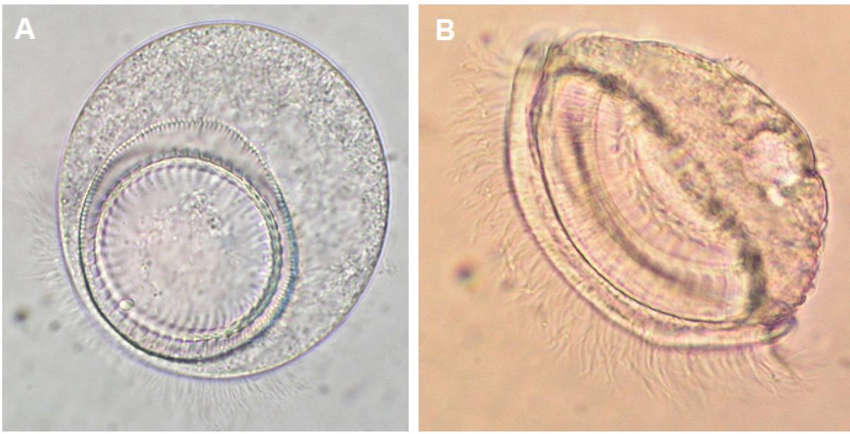 Batrachocamallanus slomei, photomicrographs. A = opening of the anterior buccal capsule. B = posterior end showing mucrons.