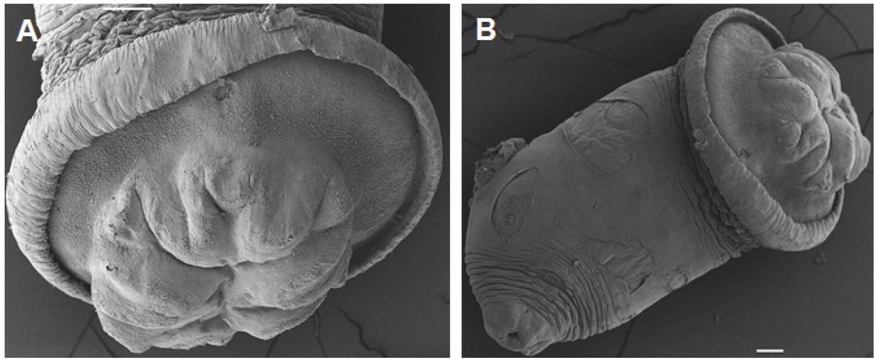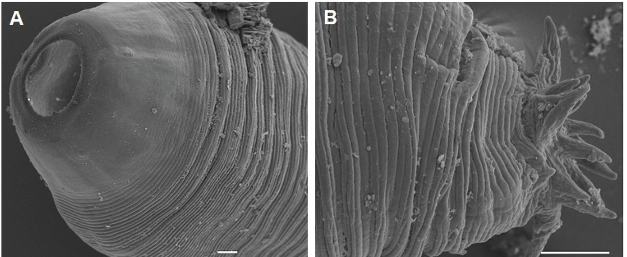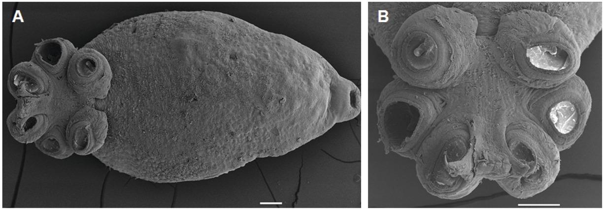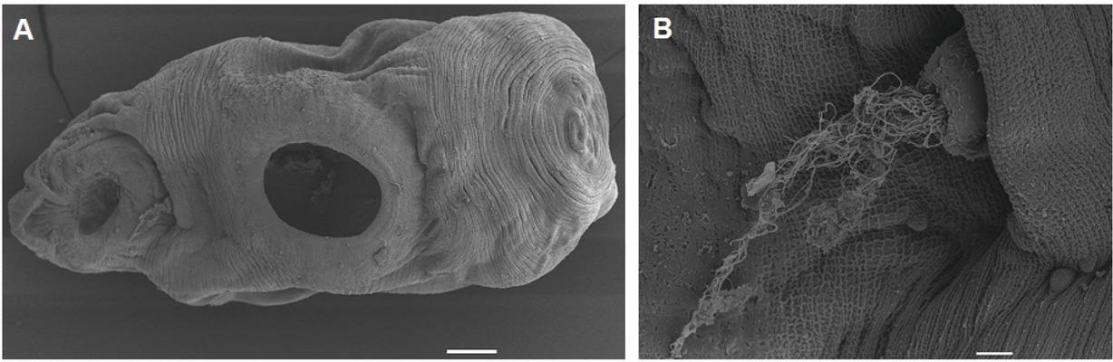 Dollfuschella rodhaini, photomicrographs. A = ventral view of D. rodhaini. B = Enlarged sinus organ. Scale bar: A = 1100 μm, B = 10μm.