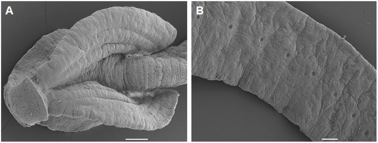 Cephalochlamys namaquensis, photomicrographs. A = enlarged view of the scolex. B = micrograph showing segments and the position of gonopores. Scale bar: 100 μm.