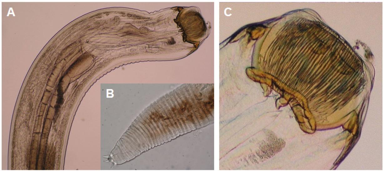 C = enlarged buccal capsule with two large valves. Scale bar: A – B = (200x), C = (400x).