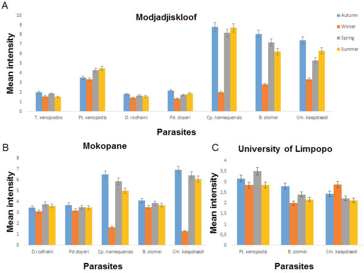 Mean intensity of parasites recorded from Xenopus laevis from Modjadjiskloof, Mokopane and University of Limpopo in different seasons. Key: T. xenopodos = Trichodina xenopodos, Pt. xenopodos = Protopolystoma xenopodis, D. rodhaini = Dollfuschella rodhaini, Pd. doyeri = Progonimodiscus doyeri, Cp. namaquensis = Cephalochlamys namaquensis, B. slomei = Batrachocamallanus slomei, Cm. kaapstaadi = Camallanus kaapstaadi.