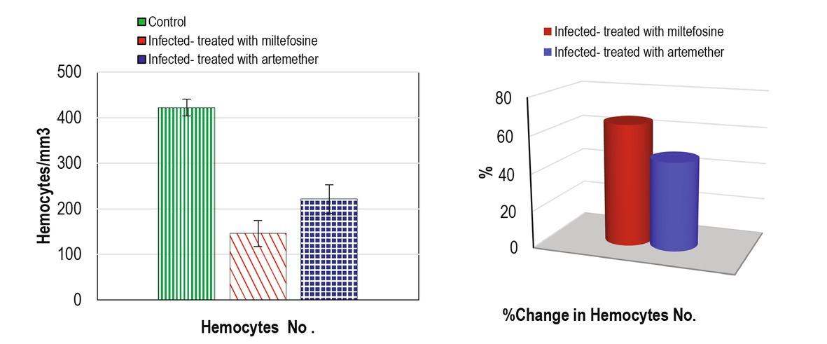 In the present study, the hemocytes of S. mansoni infected snails (had higher significant increase compared to the treated -infected snail groups with the sublethal concentration (LC25) of miltefosine and artemether as in previous studies (Mossalem et al., 2013; Ibrahim et al., 2018; Mossalem & Ibrahim, 2019). The decrease in hemocytes count in treated snail groups might be a result from tissue damage in digestive and hermaphrodite glands as they participated in tissue repair (Esmaeil, 2009). Another explanation might be the reduction in transaminase enzyme activities, sensitive tools in physiological alterations detection (Kamel et al., 2007), or perhaps, it is the result of hemocyte cells from the hemolymph migrating to connective tissues (Cochennec-laureau, 2003).