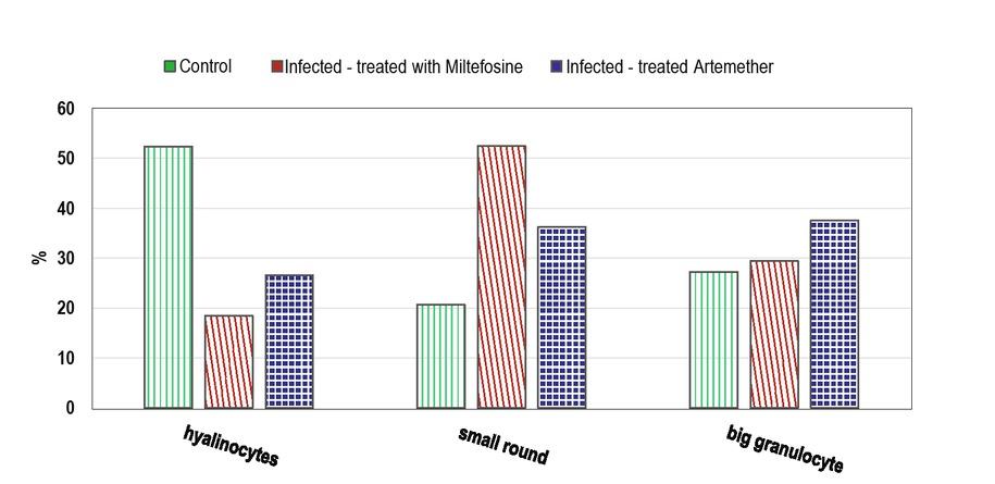 Effect of LC25 of the miltefosine and artemether drugs on % different hemocytes types in hemolymph of adult B. alexandrina snails as compared with infected snails (controls)