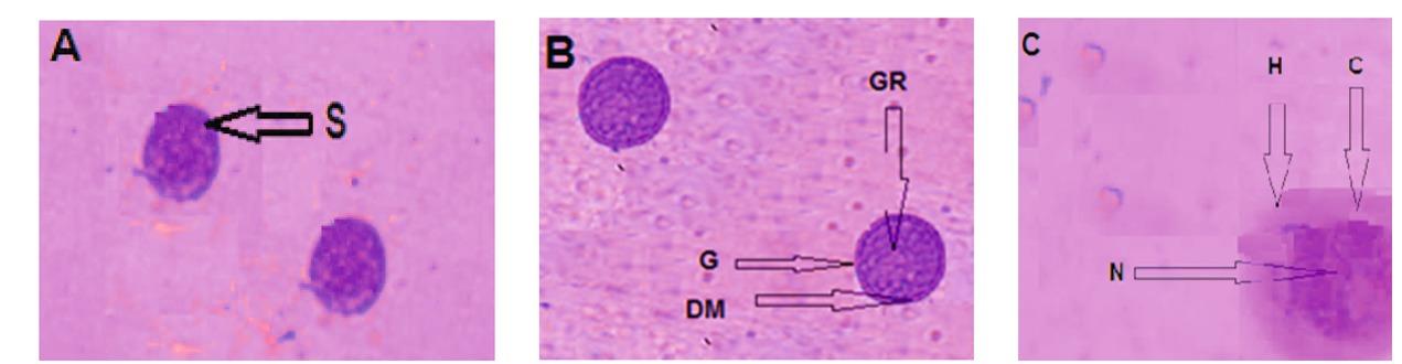A). Normal round small (non-differentiated) cells B). Granulocyte and C). Hyalinocyte of B. alexandrina adult snails (×40). S: Round small cell, G: Granulocyte, C: Cytoplasm, DM: Double membrane, GR: Granules, N: Nucleus, (H): Hyalinocyte.