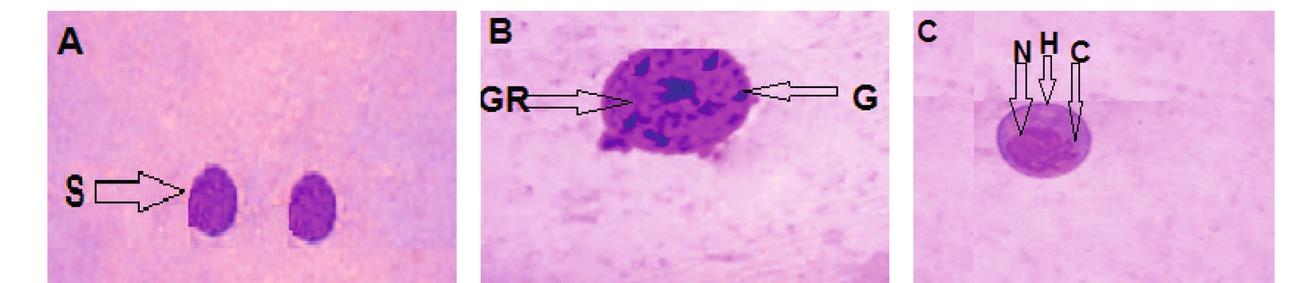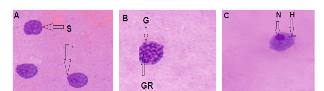 The morphological effect of artemether LC25 on different types of hemocytes in the haemolymph of treated B. alexandrina snails. A): Round small (non-differentiated), B): Granulocyte and C): Hyalinocyte (x40). S: Round small cell, G: Granulocyte, C: Cytoplasm, GR: Granules, N: Nucleus, (H): Hyalinocyte.