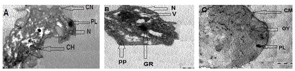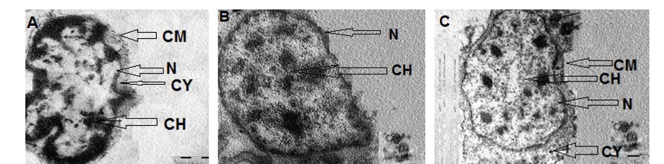 TEM micrographs showing normal cells of B. alexandrina snails, A). Round small non- differentiated cell, B). Granulocyte and C). Hyalinocyte. CH: chromatin, CM: cell membrane, CY: Cytoplasm, N: nucleus.