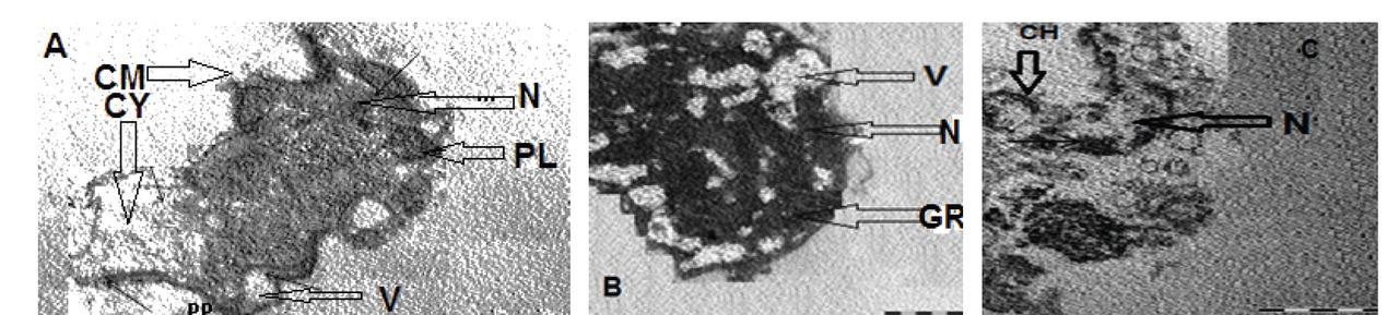 TEM micrographs showing the effect of miltefosine LC25 on hemocytes A). Round small (non- differentiated) cell, B). Granulocyte and C). Hyalinocyte of treated-infected B. alexandrina snails. CH: chromatin, CM: cell membrane, CY: Cytoplasm, GR: granules, N: nucleus, V: vacuole, PL: phagolysosome.