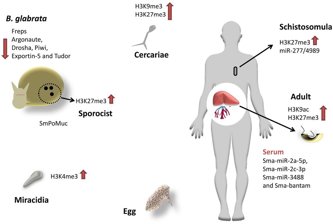 Epigenetic regulation throughout the S. mansoni cycle: The figure shows some epigenetic marks enriched in the different stages of S. mansoni and some miRNAs involved in parasite-host interaction. Larval stage mucins (SmPoMuc) interact with snail immunity proteins. The intermediate host has downregulation of several miRNA and piRNA biogenesis pathway proteins during miracidium penetration and also during the subsequent stages of development. The most enriched epigenetic marks in cercariae are characteristics of gene silencing. In schistosomes, miRNAs 277 and 4989 may be related to adult worm development. In adults there is an enrichment of epigenetic marks associated with eucromatization. There are miRNAs from the parasite that have already been found in human serum and have been proposed as possible diagnostic biomarkers.