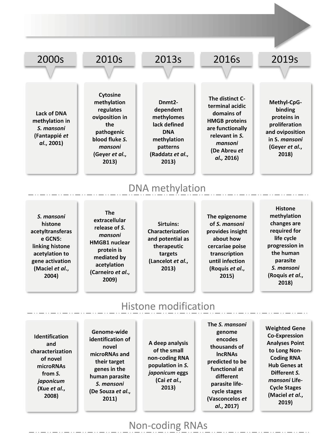 A timeline of important advances related to DNA methylation, histone modifications, and ncRNA observed for epigenetic biomarkers associated to schistosomiasis in the last 20 years is shown in Figure 2.