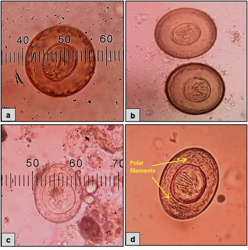 Eggs of H. diminuta in an unstained wet mount of the faecalsample showing presence of hooks in the oncosphere and no polar filaments at 40x (a & b); Eggs of H. nana in an unstained wet mount of the faecal sample showinghooks in the oncosphere and polar filaments within the space between the oncosphere and outer shell at 40x (c & d)