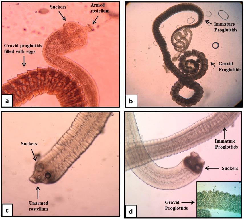 Tapeworm of H. nana showing four suckers (two visible in the view), an armed rostellum and gravid proglottids filled with eggs at 10x (a) and 40x (b); Tapeworm of H. diminuta showing four suckers, but only two visible in this view, an unarmed rostellum, mature proglottids and gravid proglottids containing a large number of eggs at 40x (c and d)