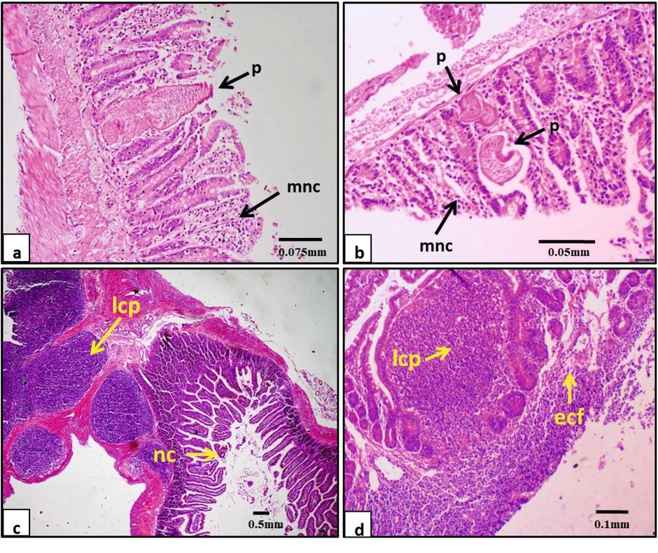 Section of intestine showing parasitic enteritis (p), scolex of H. nana embedded in the mucosa (arrows), sloughing of intestinal mucosa with infiltration of mononuclear cells (mnc) and necrosis (nc) of villi at 20x (a)&40x (b); Section of intestine infected with H. nana showing severe mucous degeneration with lymphoid cell proliferation (lcp) andnecrosis in the submucosa (arrow) at 4x (c); Section of intestine infected with H. diminuta showing lymphoid cell proliferation (lcp) and eosinophilic cellular infiltration (ecf) in the submucosa at 10x (d)