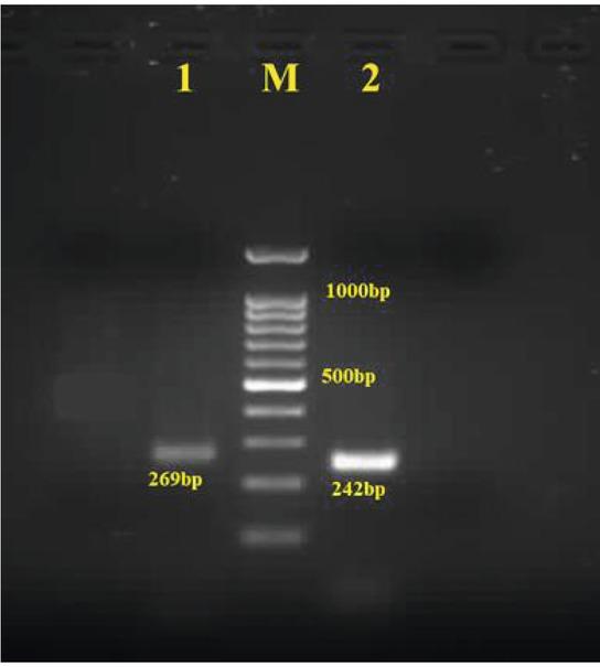 The PCR amplification of ITS-2 regions of the adult cestodes showing single band of H. diminuta (269 Bp) and H. nana (242 bp)