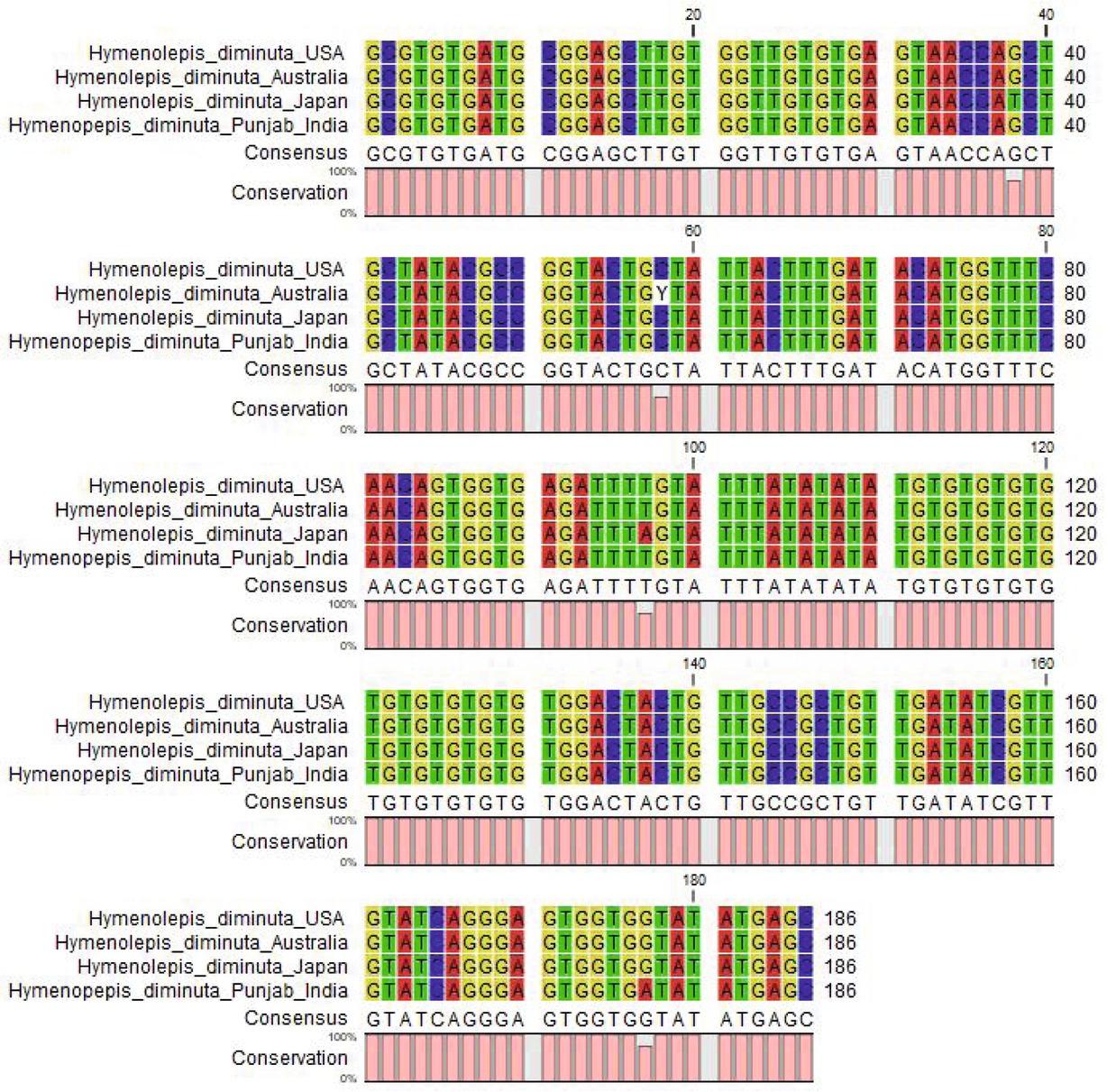 Multiple alignment of H. diminuta (Punjab, India) with different geographical isolates.