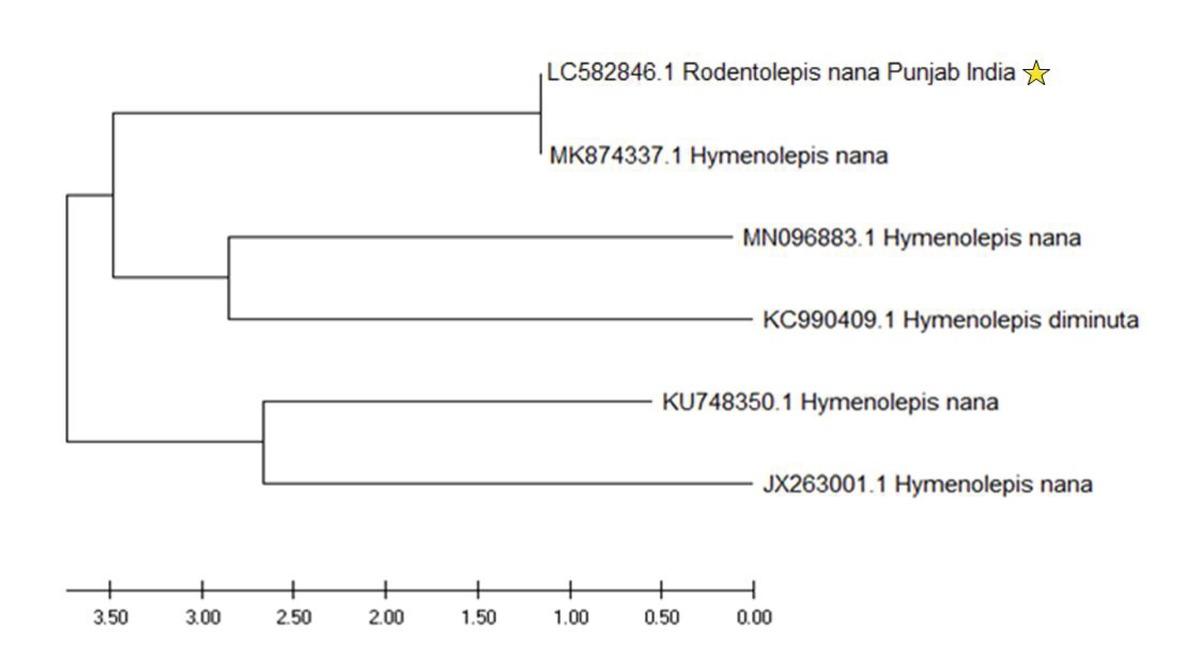Phylogenetic tree of H. nana (Punjab, India) constructed using Maximum Likelihood method in MEGA X software.
