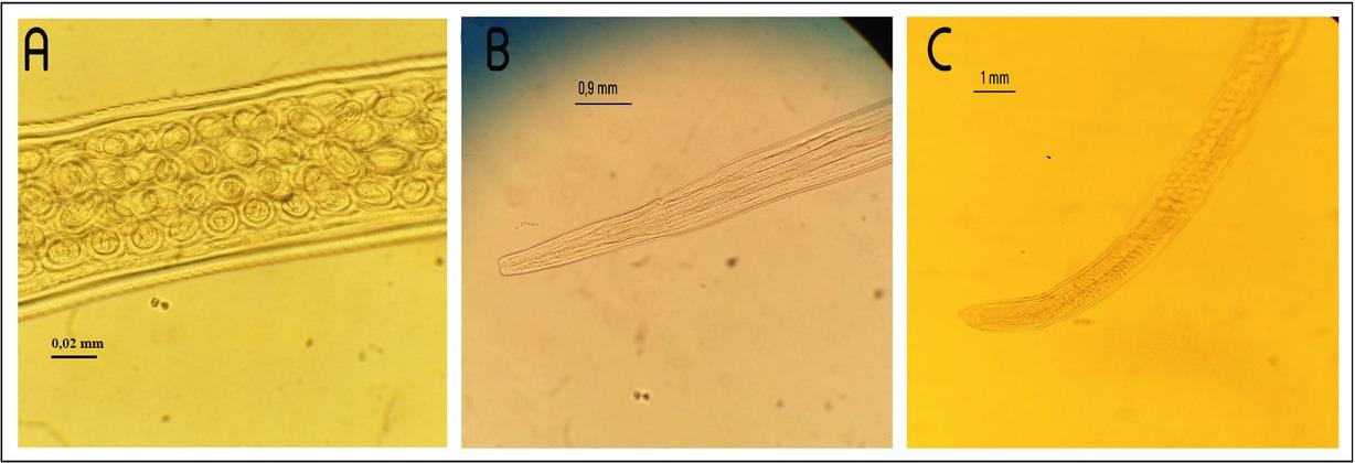Capillaria gracilis.A: eggs, B: Anterior, C: Posterior (♀)