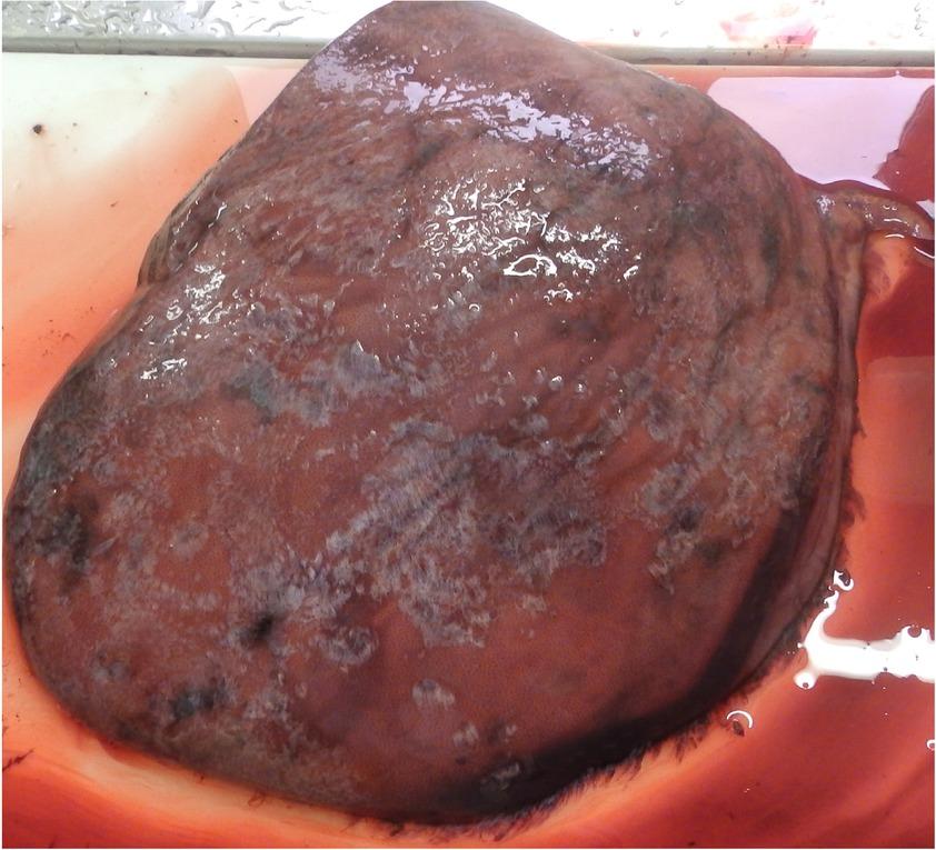 Part of the mouflon liver. Note fibrin deposits and black stained traces (iron-porphyrin).