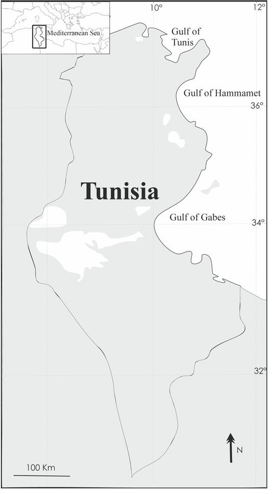 Tunisian coastal waters are located in the south-central Mediterranean Sea. Tunisia has a 1670- km coastline including 7 coastal lagoons, covering a total surface of 105200 ha and an exceptional continental shelf of 88 000 km2 (Cherif et al., 2011). It also has a large hydrographic network in the north. The surface water accommodates a relatively high faunal diversity, especially in terms of aquatic vertebrates that can host a high species richness of parasites. Among them, monogeneans (Plathyhelmintes) which are commonly found on fishes can also parasitise freshwater turtles and amphibians. These parasites are ideal for diversity investiga